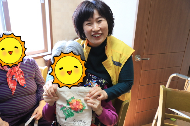 다 만든 가방에는 어르신 이름도 써드리고 준비해간 간식 두유도 넣어드렸다.