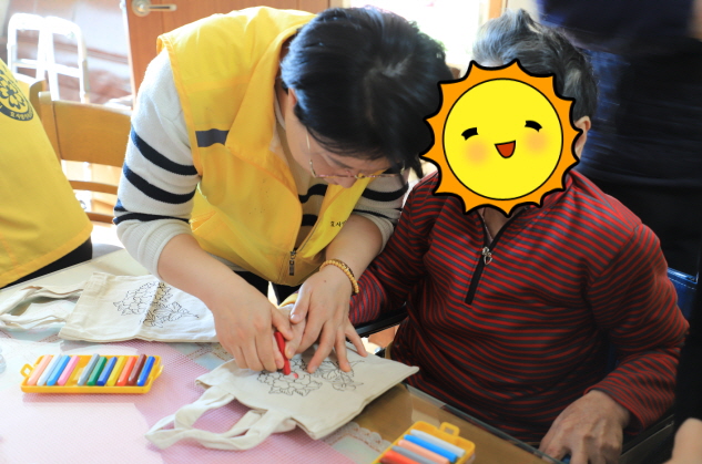 어르신들께 인사를 드리고 1:1로 짝꿍을 맺어서 가방을 예쁘게 색칠하고 담소도 나누는 시간을 보냈다.