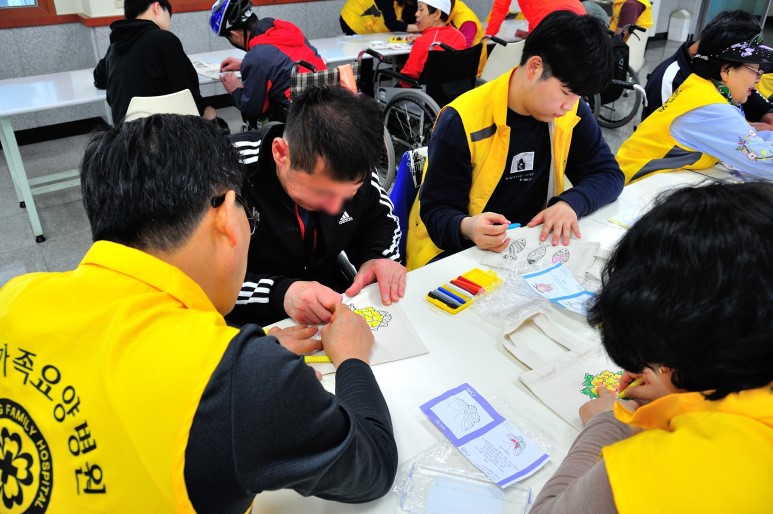 그리고 다시 동암재활원으로 돌아와서 옹기종기 모여앉아 "나만의 가방만들기"를 했는데,