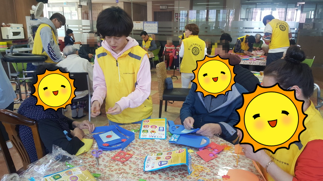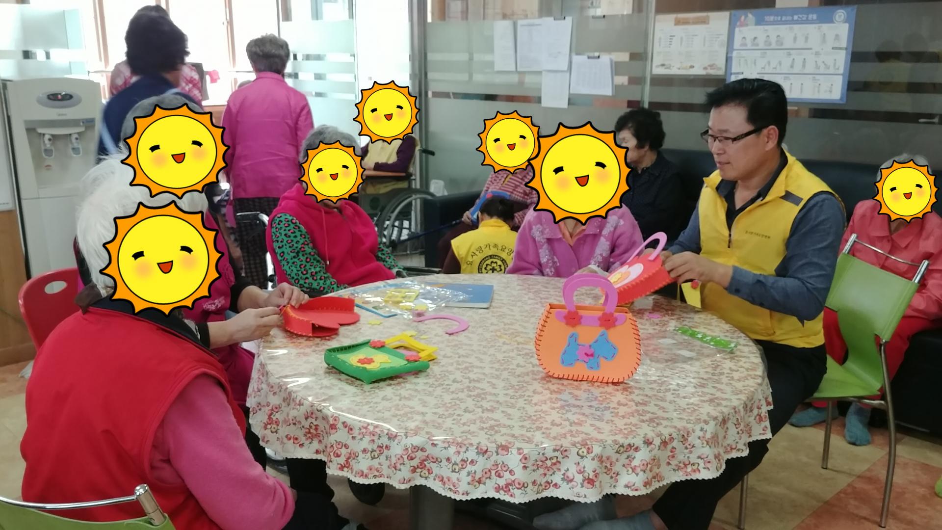 주간보호어르신. 원내어르신 30여명과 효사랑직원들이 모여서 알록달록 효사랑명품 핸드백을 만들었다.