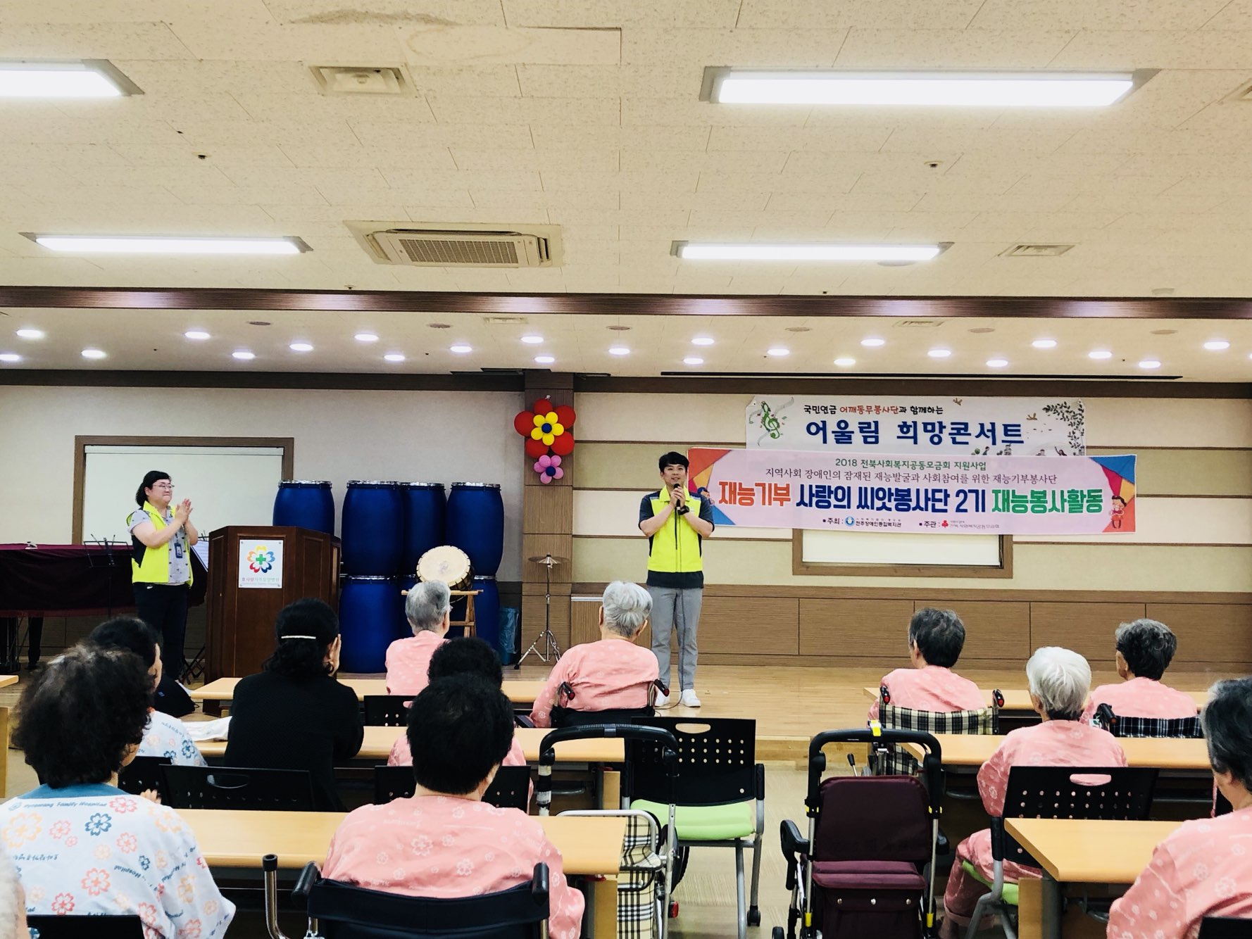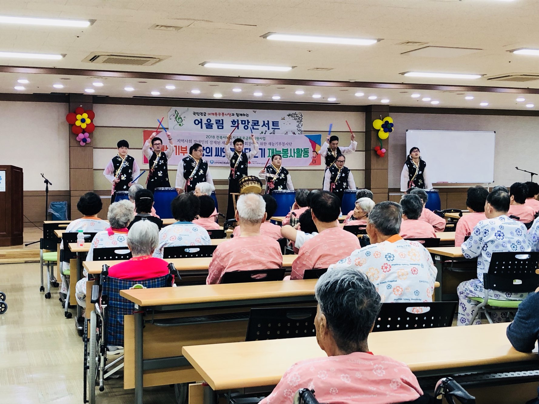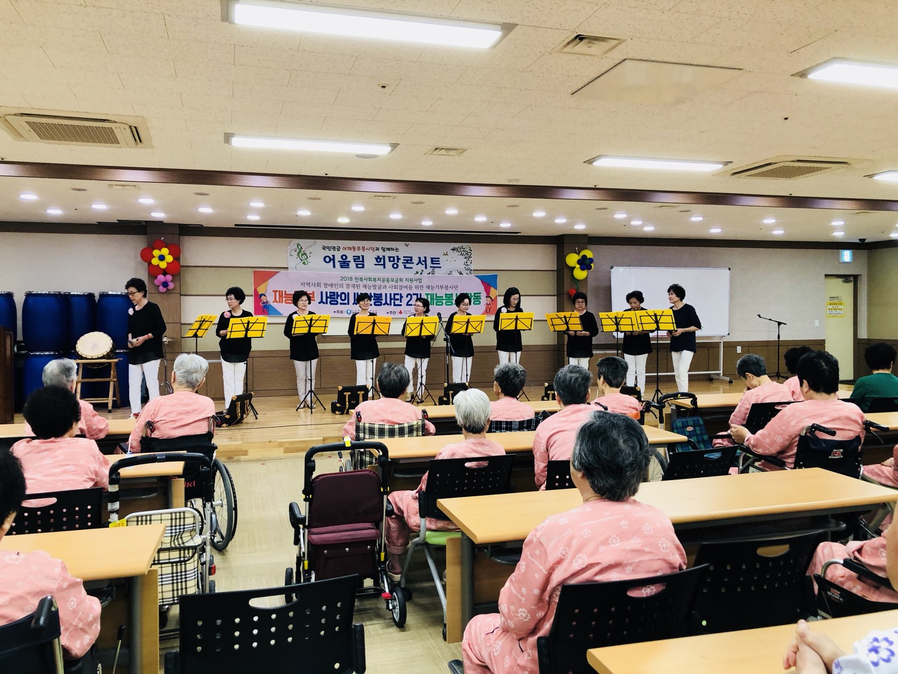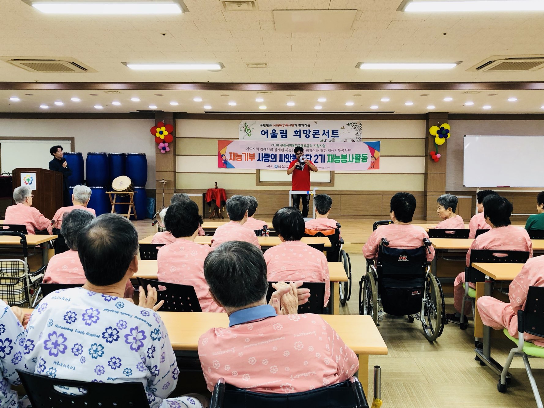 9월 20일(목) 국민연금 어깨동무봉사단과 전주장애인복지관 사랑의 씨앗봉사단이 오셔서 환우분들을 위한 공연과 기능봉사를 했다.